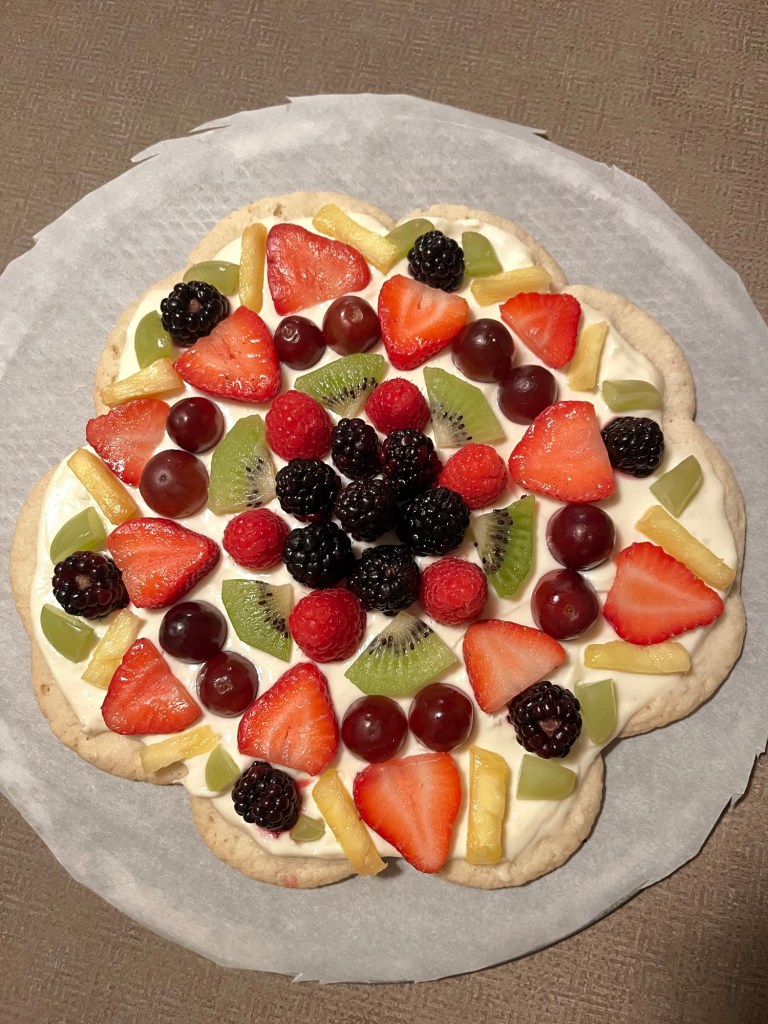 The following day we drove through downtown Flagstaff and hiked Old Caves Crater trail, which offered panoramic views of Flagstaff and the surrounding mountain peaks. At the summit of the trail there were a few small craters and caves from old volcanic activity. The hike back down there were a few distant gun shots, Kida deemed the scene not safe and despite many coaxing attempts refused to continue toward the gunshots, thus resulting in her being carried until we reached level ground. I can confirm at 8,000 feet carrying a 40 pound dog down the trail was much closer to killing me then the distant gunshots. Meghan and Sonya manned the grill when we got back and whipped up a phenomenal steak dinner while I prepped the base and frosting for a fruit pizza for dessert. The fruit placement became a group art activity taking around two hours to meticulously place each piece and decide the design.