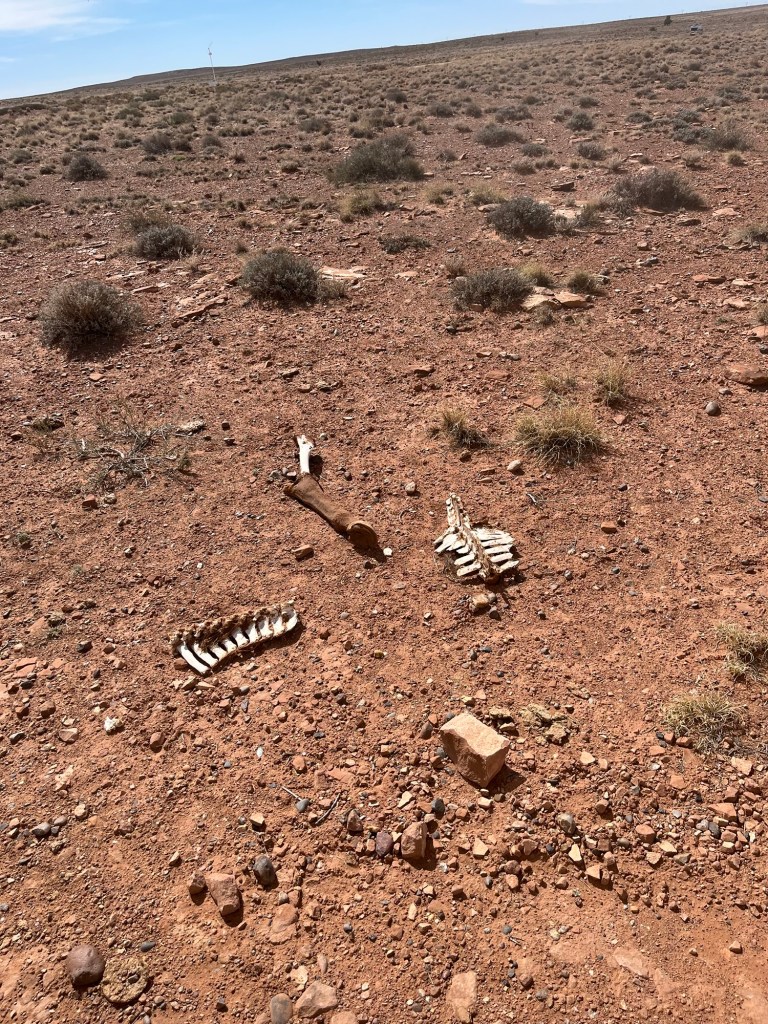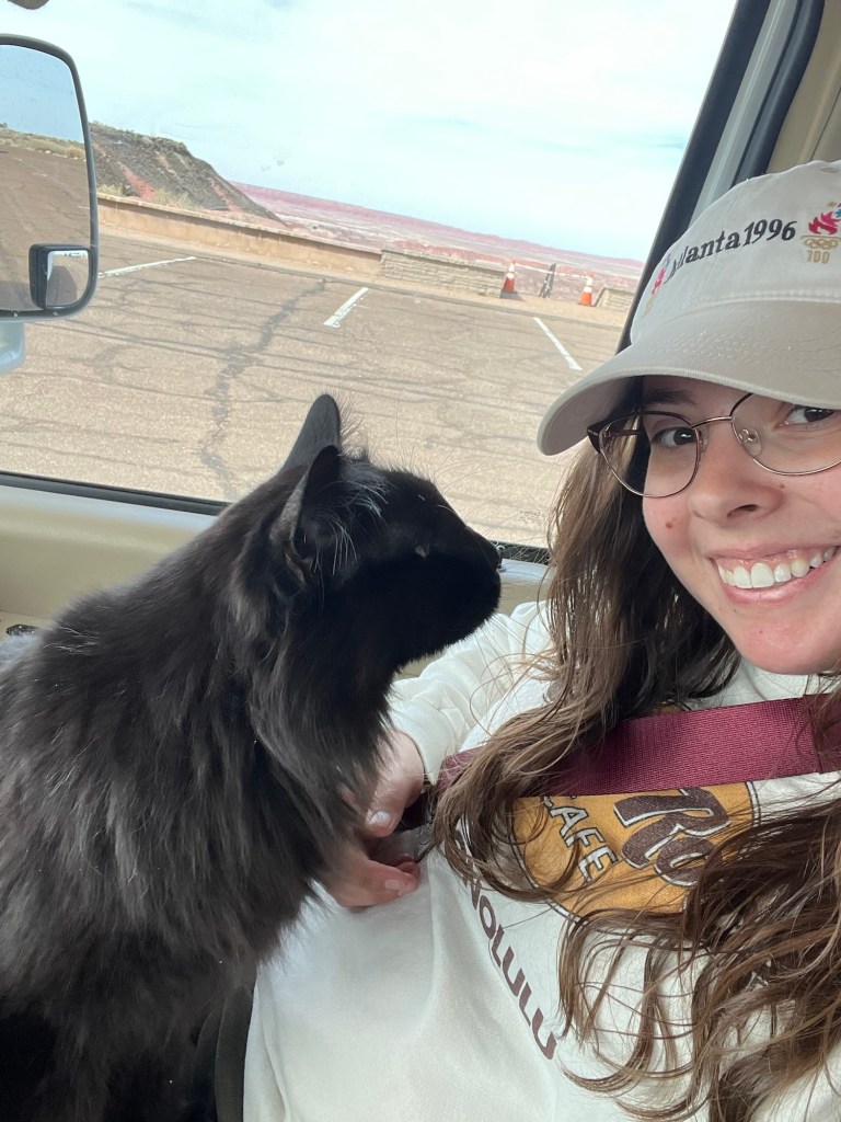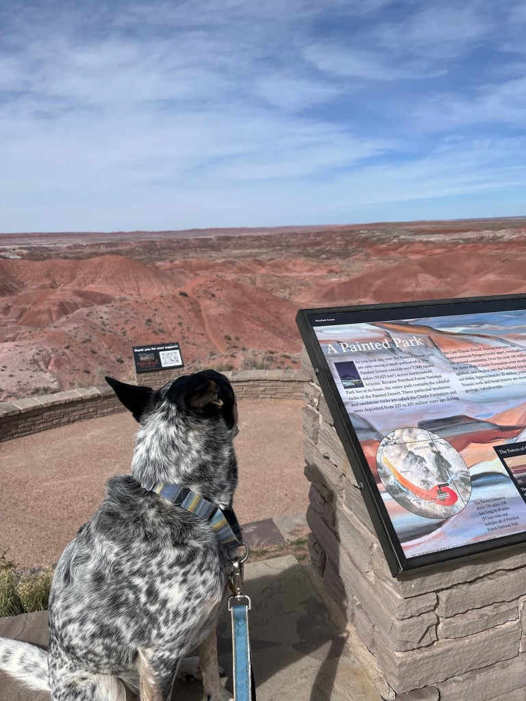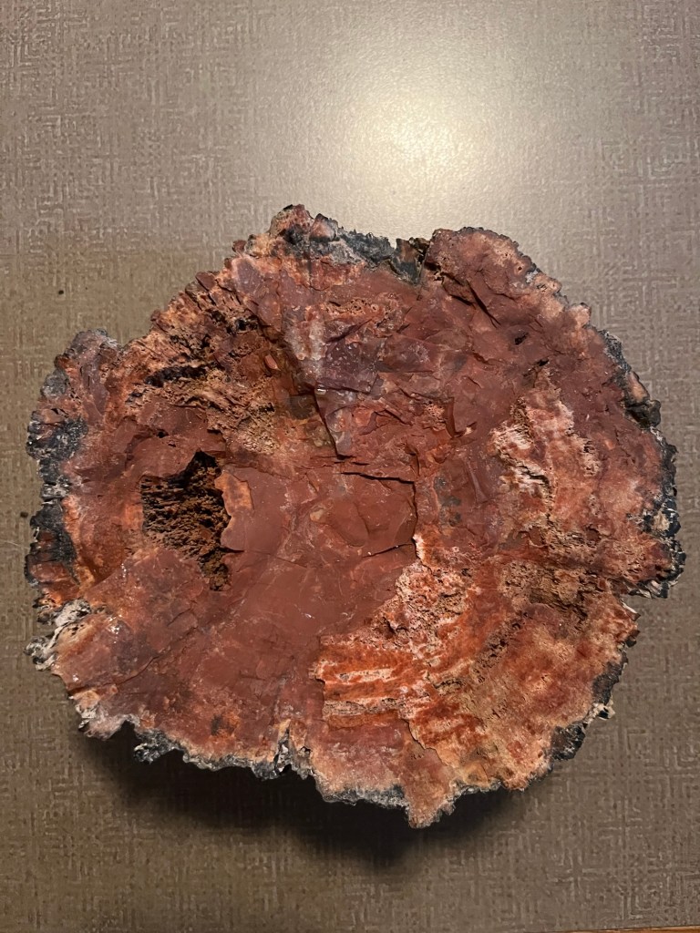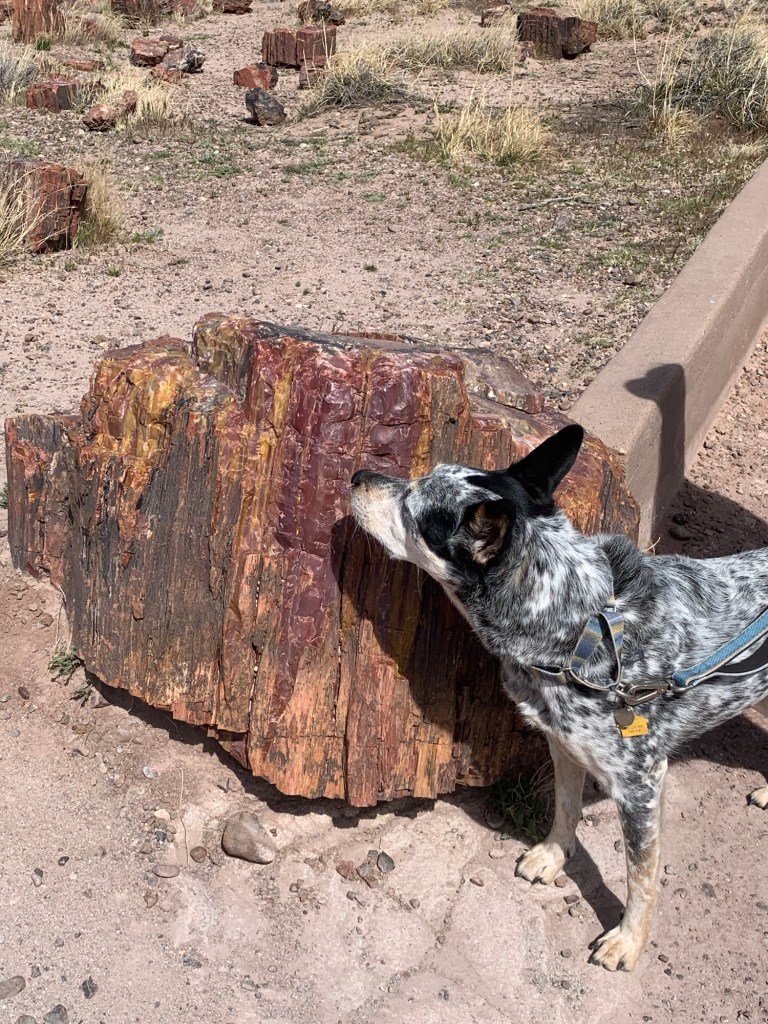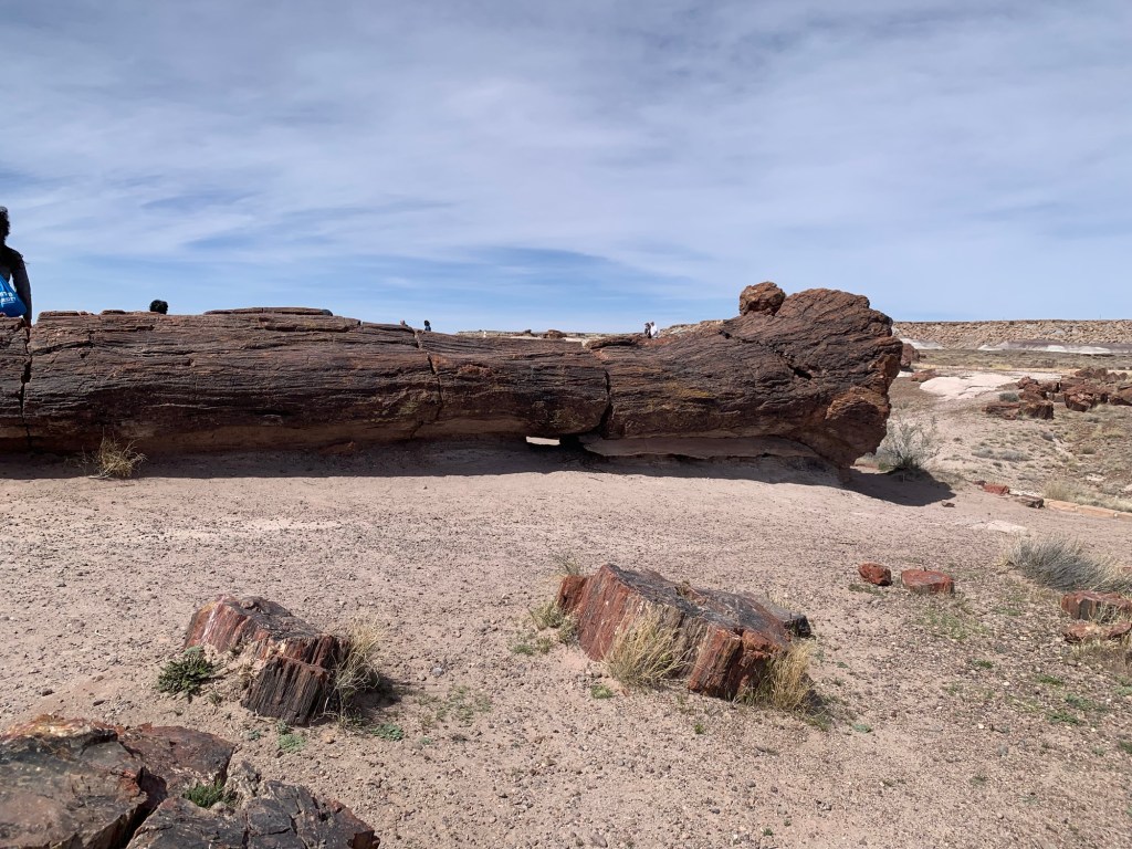 Our second stop was the one I was most excited for, the National Petrified forest! So prepare yourself for a bit of a nerd out (even more so than above). The park nearly the size of Rhode Island sits on what was a river flood plane and large coniferous forest 200 million years ago. When trees fell near the flood plane during that time they were washed into the river and rapidly covered with sediment the most important for the petrifaction being volcanic ash. Volcanic ash is incredibly rich in silica and the lack of oxygen due to heavy sediment slowed normal decomposition of the trees and instead the silica cell by cell turned the wood into solid quartz. The petrified wood remained deeply buried for the next 130 million years until the Colorado Plateau began to rise due to tectonic plates shifting. This forced the area upwards around 6,000 feet over the course of millions of years and erosion began stripping layers away eventually revealing the 200 million year old forest remnants. The now quartz wood has incredible coloration from different elements combining with the silica, deep reds, pink, and yellow from iron, black from carbon, purple and black from manganese, and white in areas of pure silica. What I find incredibly cool is the preservation of tree rings, bark, and the cellular structure that can be seen! I’ll stop there as far as the wood goes and apologize in advance for failing to take more pictures.